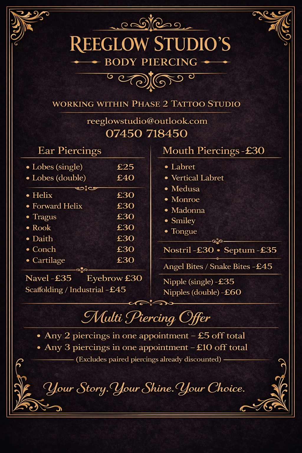 At Reeglow Studios, we believe in providing exceptional body piercing services with clear, upfront pricing. Our fees reflect our expertise, the sterile environment we maintain, and the superior quality of the materials we use. Each piercing service includes high-grade, internally threaded or threadless titanium jewellery in a classic silver finish, ensuring a safe and comfortable healing process.